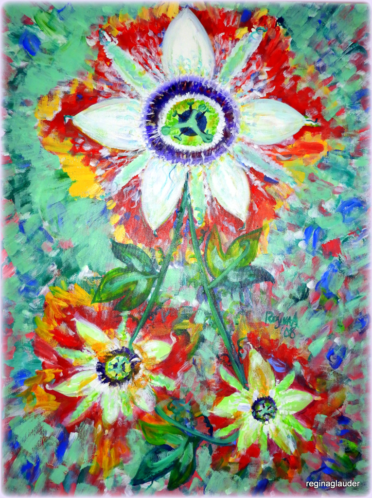“PASSION FLOWERS”, A/C (acrylic on canvas), 40 x 30″.