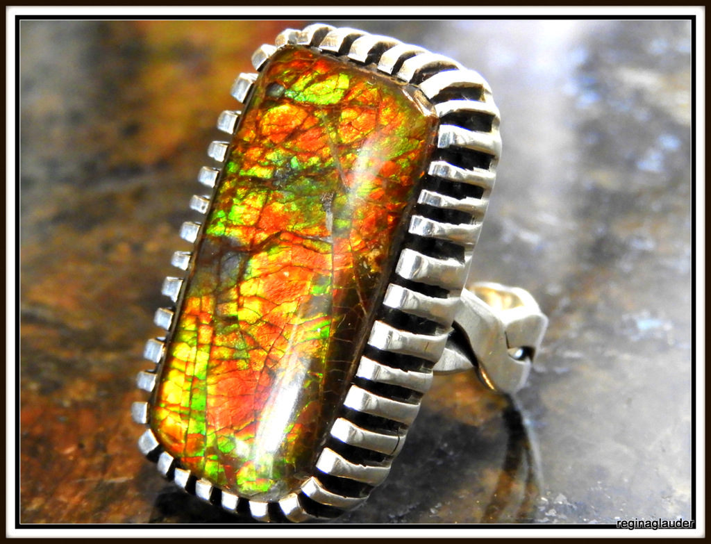 Ammolite Fossil Ring. Canadian genuine AMMOLITE FOSSIL (12x25mm), 100 million years old. STERLING SILVER. Bezel is “castellated” hand cut and very labor intensive. SIGNED. Ring Size, 7.